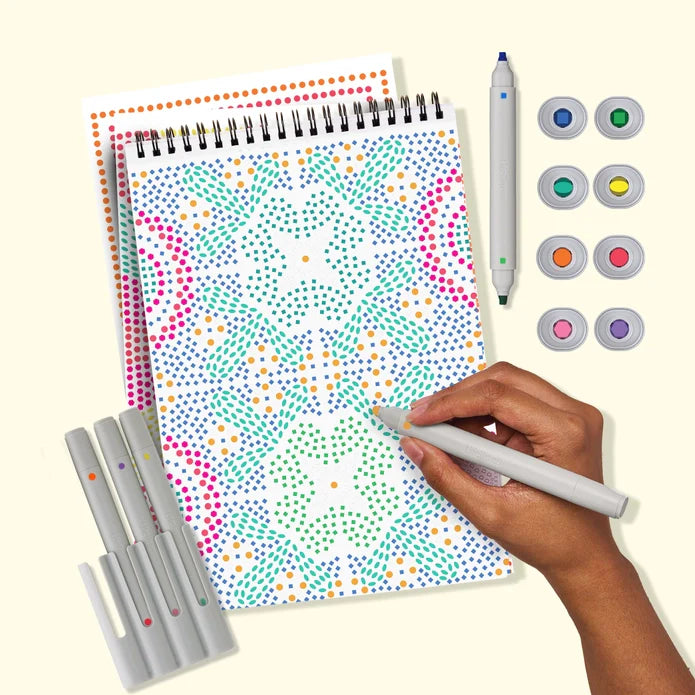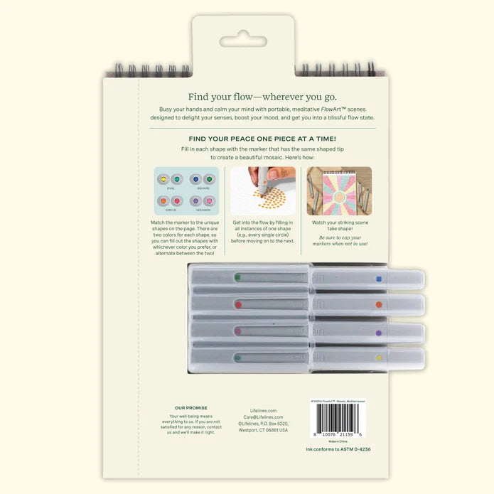 Lifelines FlowArt Pads are guided art meditations designed to help you achieve a calming flow state. Each scene is thoughtfully crafted to encourage repetitive, relaxing movements, promoting mindfulness and reducing stress. Mosaic Designs includes 20 meditative scenes and four double-sided "shape" markers in a detachable storage tray. Each marker has a uniquely shaped tip—oval, square, hexagon, or circle. Match each marker to the corresponding shape on the page to create a stunning, original mosaic. Compact and portable, this pad is perfect for calming your mind on-the-go, unwinding before bed, or taking a work or study break to de-stress.